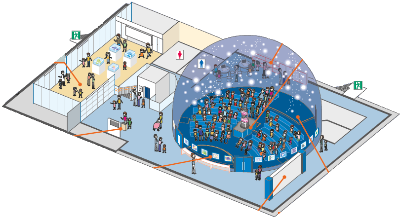 | 2階 | プラネタリウム:約177平方メートル 132席 企画展示室:約100平方メートル ウォールギャラリー:約250平方メートル |