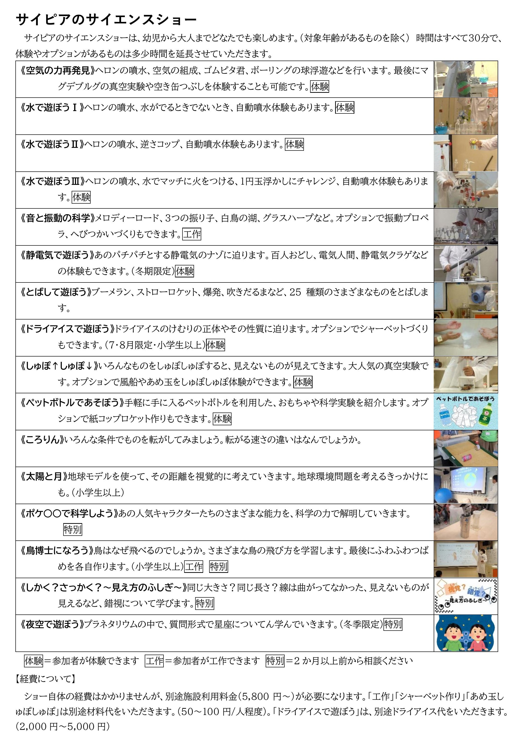 一般団体向けサイエンスショーテーマ一覧