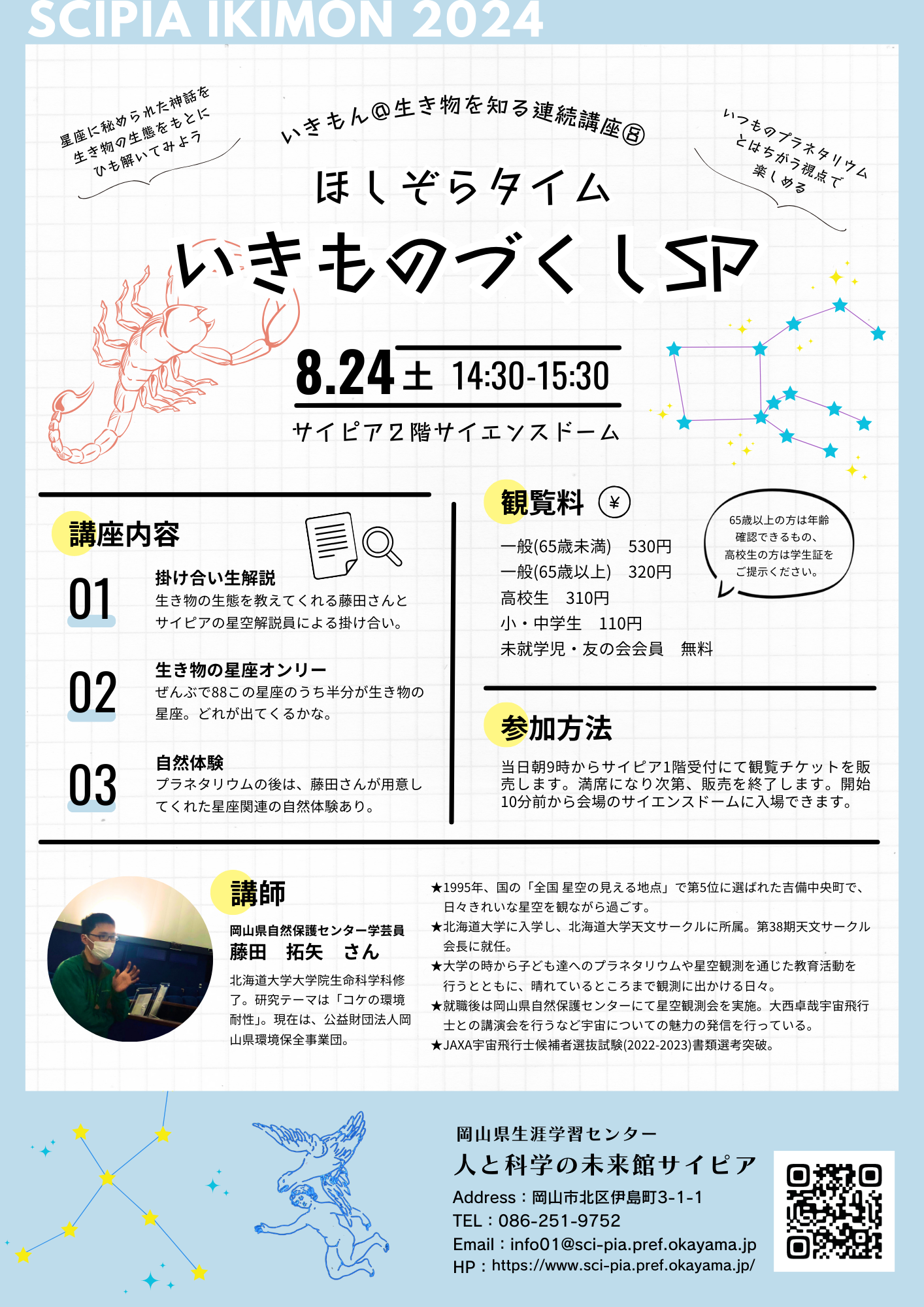 生き物にくわしい岡山県自然保護センターの藤田拓矢さんと、サイピアの星空解説員が掛け合いで生解説!