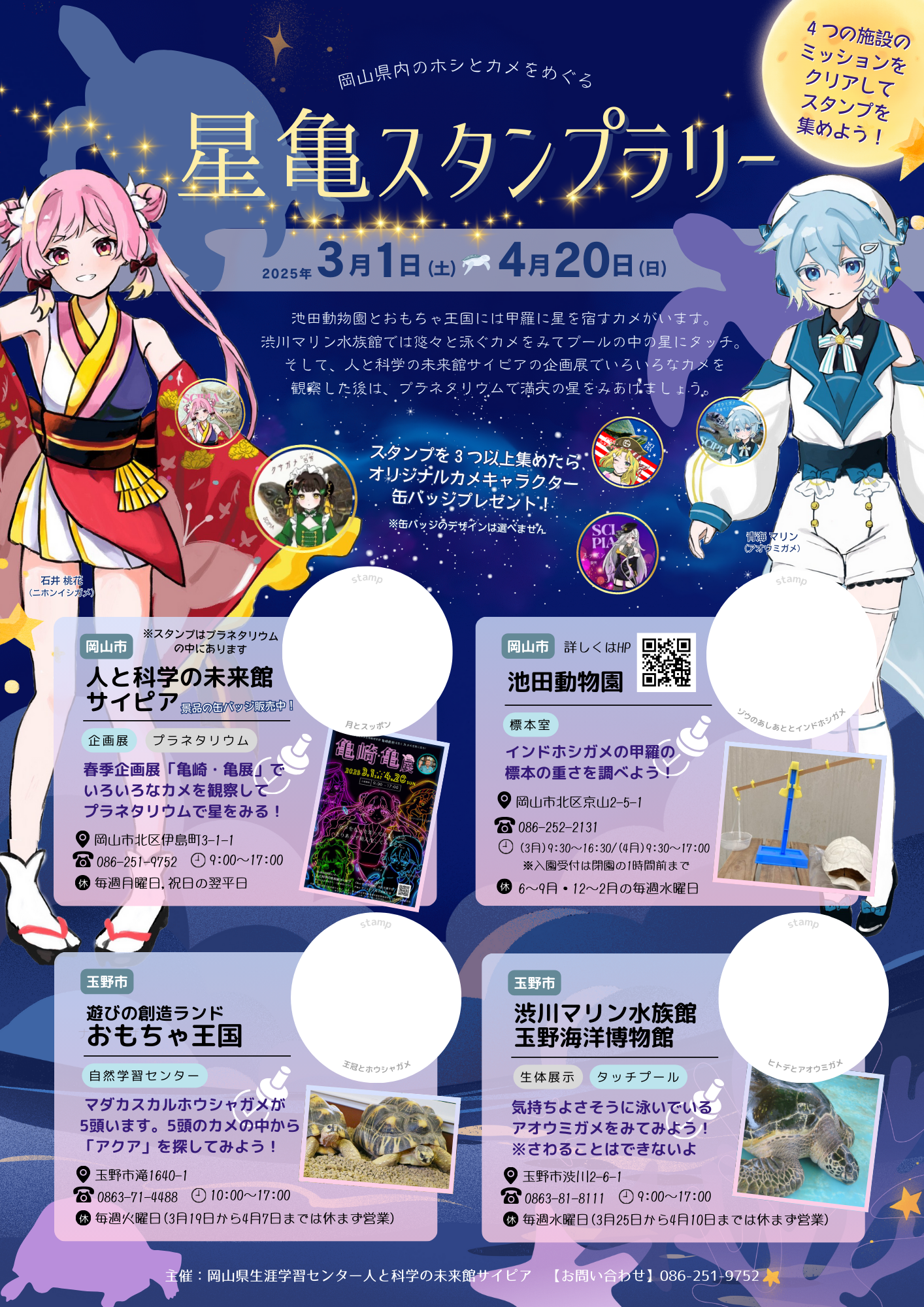 池田動物園とおもちゃ王国には甲羅に星を宿すカメがいます。渋川マリン水族館では悠々と泳ぐカメをみてプールの中の星にタッチ。そして、人と科学の未来館サイピアの企画展でいろいろなカメを観察した後は、プラネタリウムで満天の星をみあげましょう。