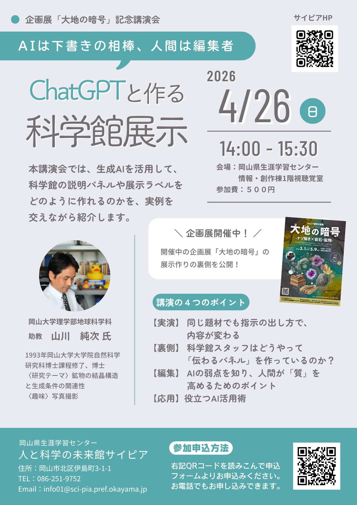要申込企画展記念講演「ChatGPTと作る科学館展示」(4/26)