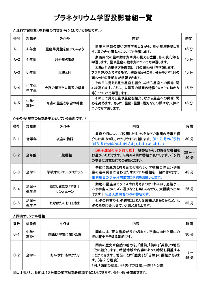 学校・園利用のプラネタリウム学習番組はこちらになります。
